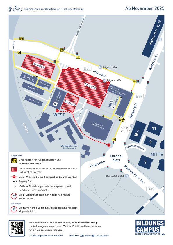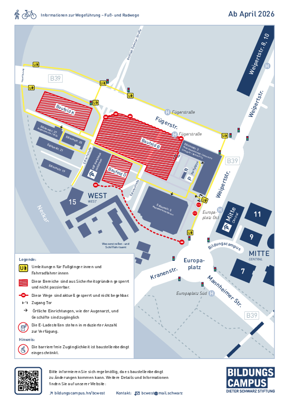 Here you will find all the information about the Bildungscampus West extension, such as the current status of the construction work and information about routing on the site. We endeavor to provide you with all developments in good time. Unfortunately, despite forward-looking planning, we cannot rule out changes at short notice. Therefore, please check our website regularly. Thank you for your understanding!